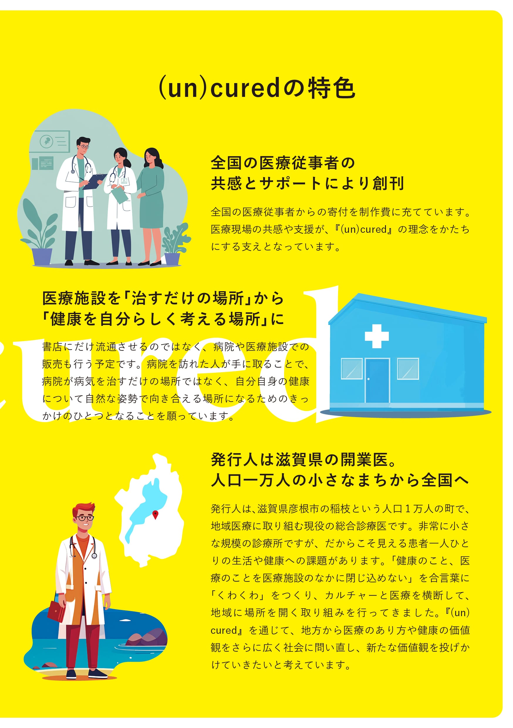 冊子名である“(un)cured”には、「治しきれていない」「未硬化の」といった意味があります。この言葉を軸に、医療者も非医療者も、健康や生命について横並びで語り合える場をつくっていければと考えています。