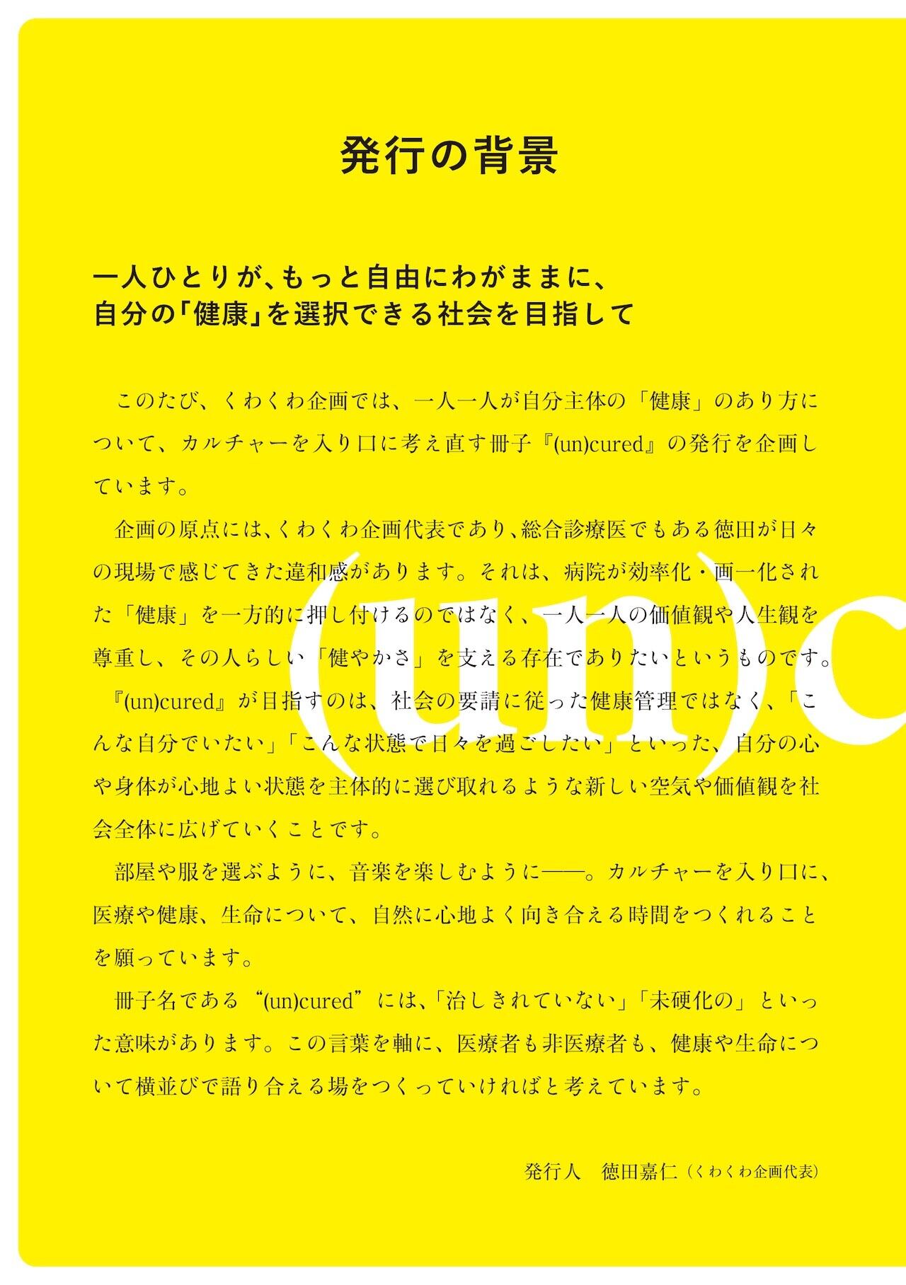 このたび、くわくわ企画では、一人一人が自分主体の「健康」のあり方について、カルチャーを入り口に考え直す冊子『(un)cured』の発行を企画しています。