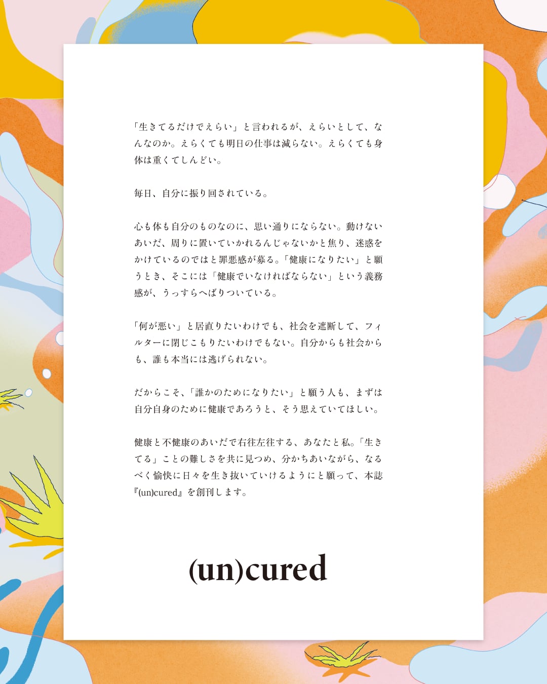 本冊子『(un)cured)』は、外側から押し付けられるものとしての「正しい健康」ではなく、「自分が自分のために健康であろうとすること」を肯定し、カルチャーを入り口に、健康について主体的かつ自由なムードで考えられる状態をつくることを目指します。